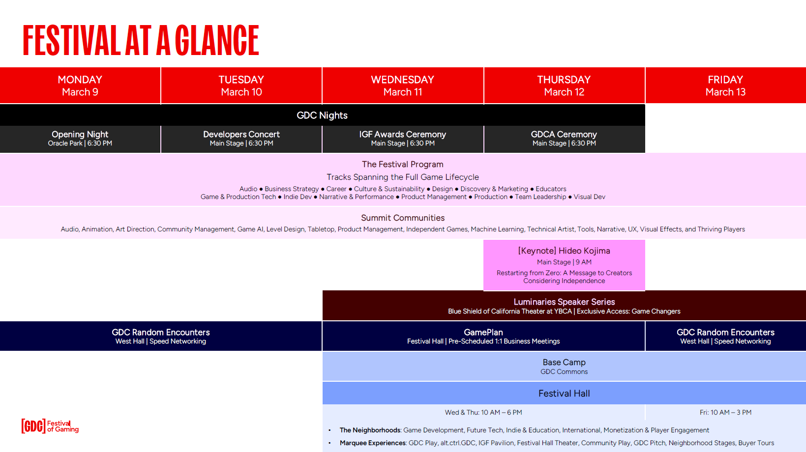 Your build zone. Get hands on with engines, tools, pipelines, and production craft. Home to the Festival Hall Theater (with GDC Pitch) and the brand-new, interactive Game Development bar & lounge.
