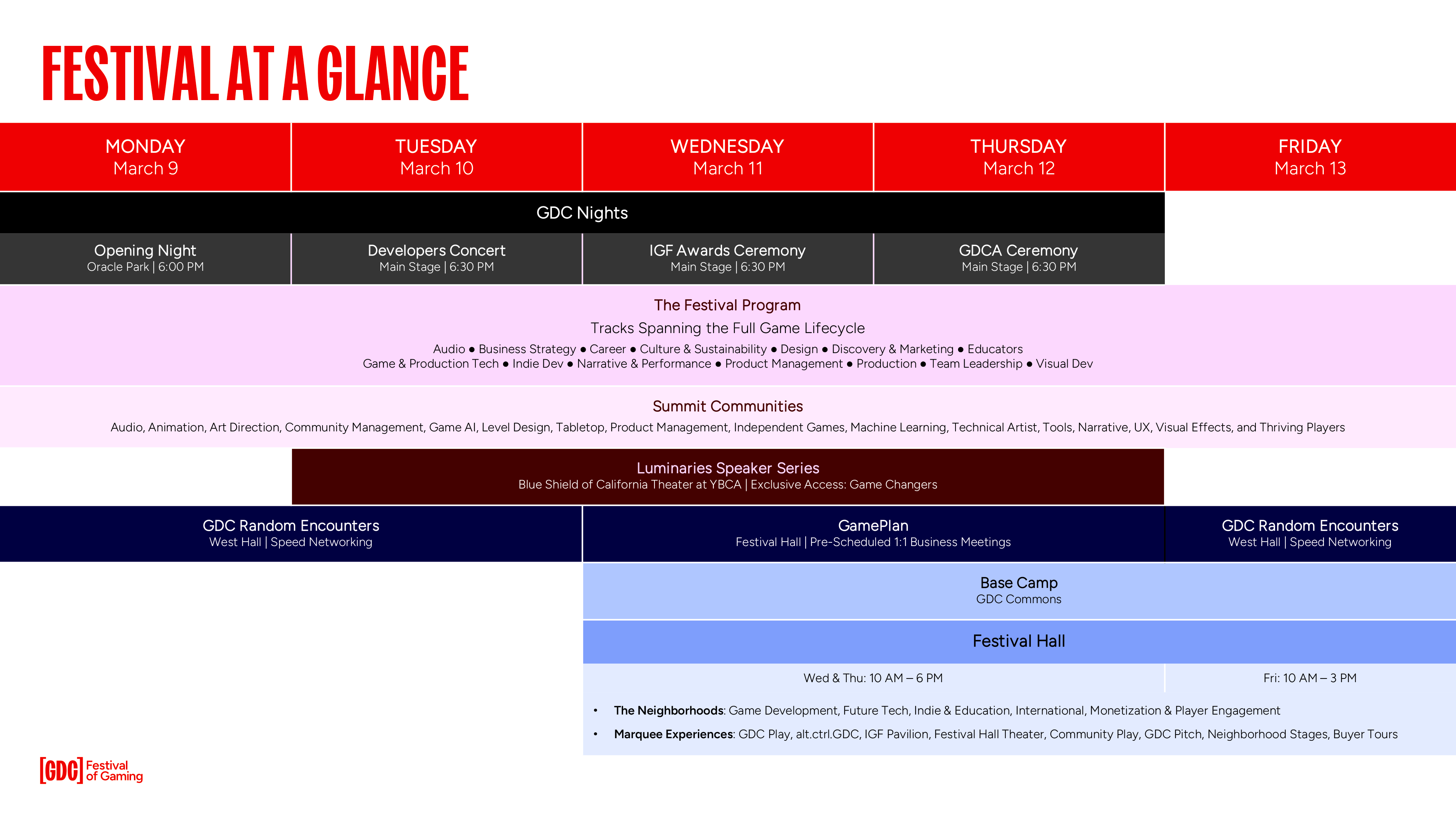 - GDC Nights now runs Monday-Thursday! Four official nights to celebrate the industry, not scramble for plans: