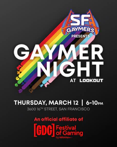 SF Gaymers’ annual Game Developers Conference party and fundraiser! We encourage everyone to take a load off with dancing, drinks, games, and charity auction.