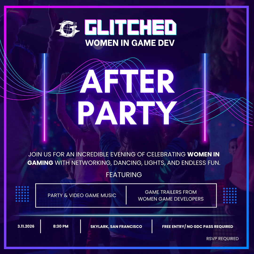 GLITCHED - Women in Game Dev is hosting an Afterparty during GDC Festival of Gaming filled with networking, dancing, upbeat party & video game music, and synchronized party lighting coupled with videos of games made by women playing on the monitors all throughout the night! 🥳